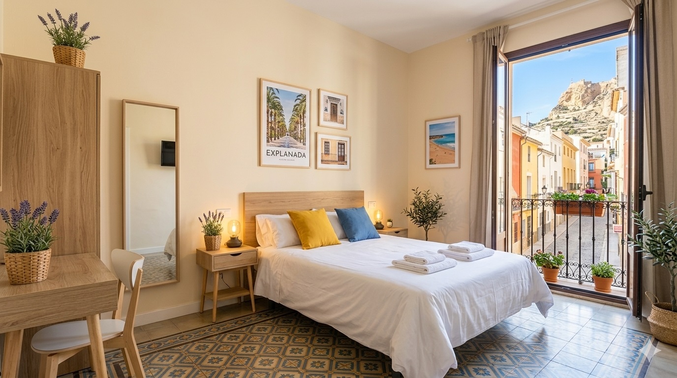 Nuestra habitación más especial. Sal al balcón para sentir el pulso de Alicante. Espaciosa, techos altos y toda la luz del Mediterráneo entrando por tu ventana cada mañana.